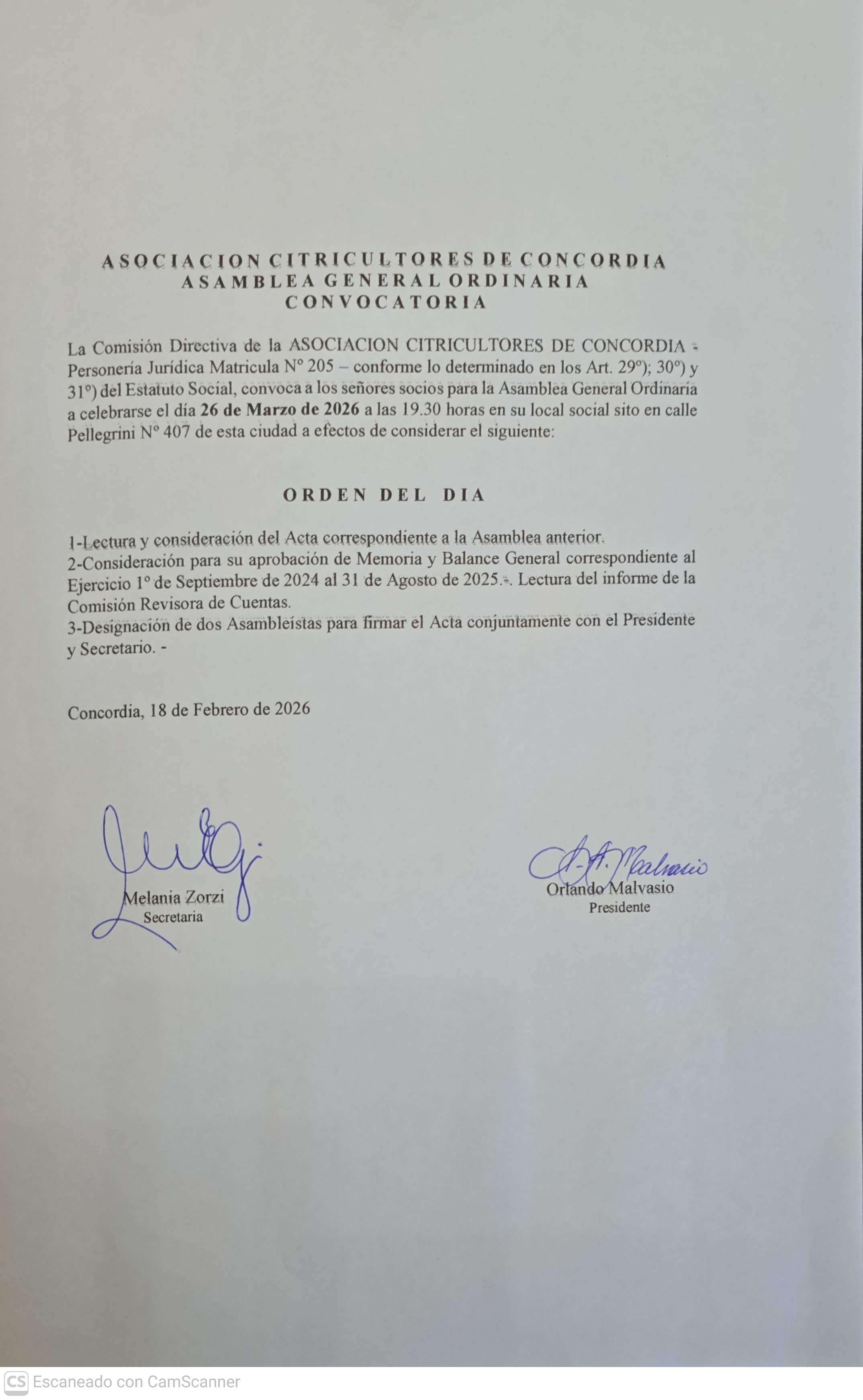 La Comisión Directiva de la ASOCIACION CITRICULTORES DE CONCORDIA - Personería Jurídica Matricula Nº 205 – conforme lo determinado en los Art. 29º); 30º) y 31º) del Estatuto Social, convoca a los señores socios para la Asamblea General Ordinaria a celebrarse el día 26 de Marzo de 2026 a las 19.30 horas en su local social sito en calle Pellegrini Nº 407 de esta ciudad a efectos de considerar el siguiente:
